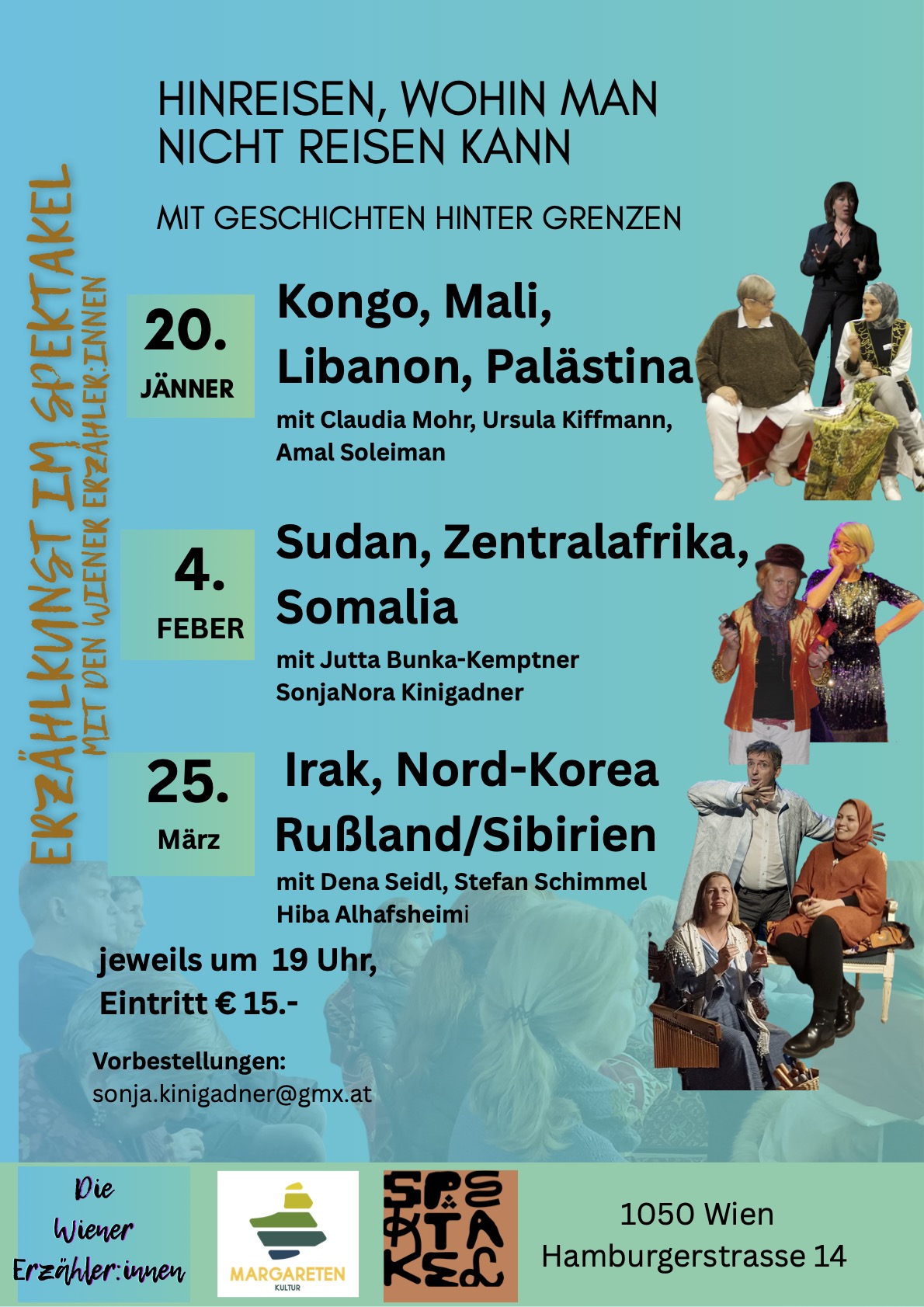 Zwischen Jänner und März können Sie im Rahmen eines Erzählkunstabends im Theater Spektakel dorthin reisen, wohin man es nicht kann. Die Wiener Erzähler:innen bringen Ihnen Geschichten mit aus Afghanistan, Irak, Palästina, Sudan, Kongo und Somalia und anderen. Soweit es uns gelingt, hören