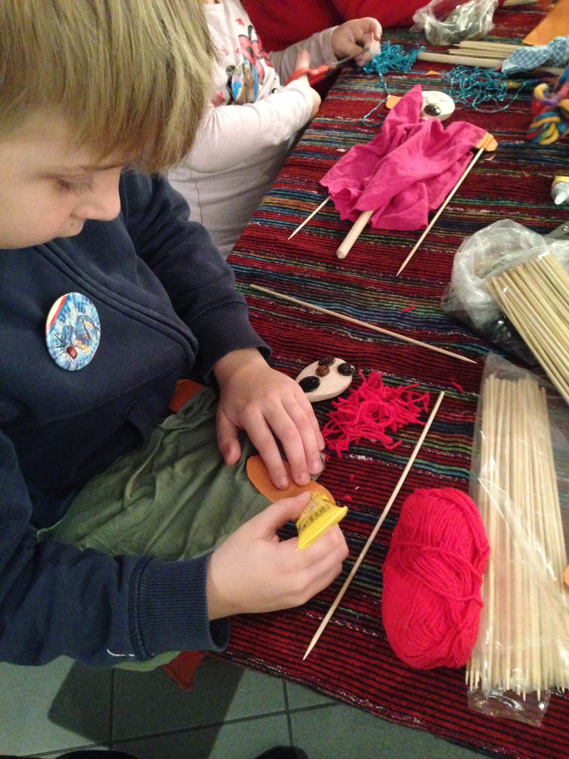 Workshop für Puppen/Marionetten basteln um 11:00h (circa 90 Minuten). Minimum 10 Kinder. Ab 2 Jahre.