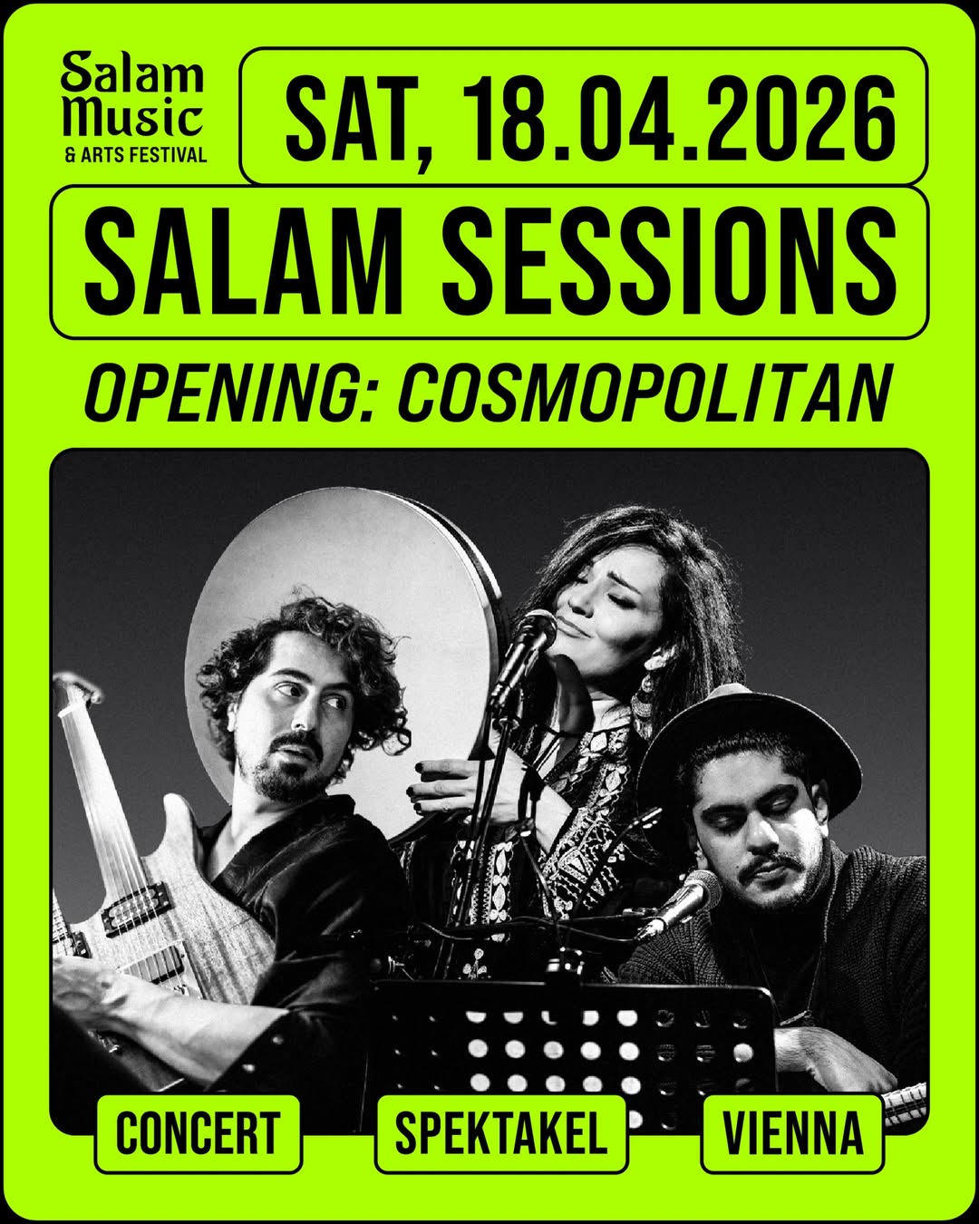 Im Anschluss an das Konzert lädt der Host von Salam Sessions, Orwa Saleh, zur legendären Open Jam Session auf die Bühne im Spektakel ein. Musiker*innen können sich unter Angabe ihres Instruments unter salon@salam-music.at anmelden.