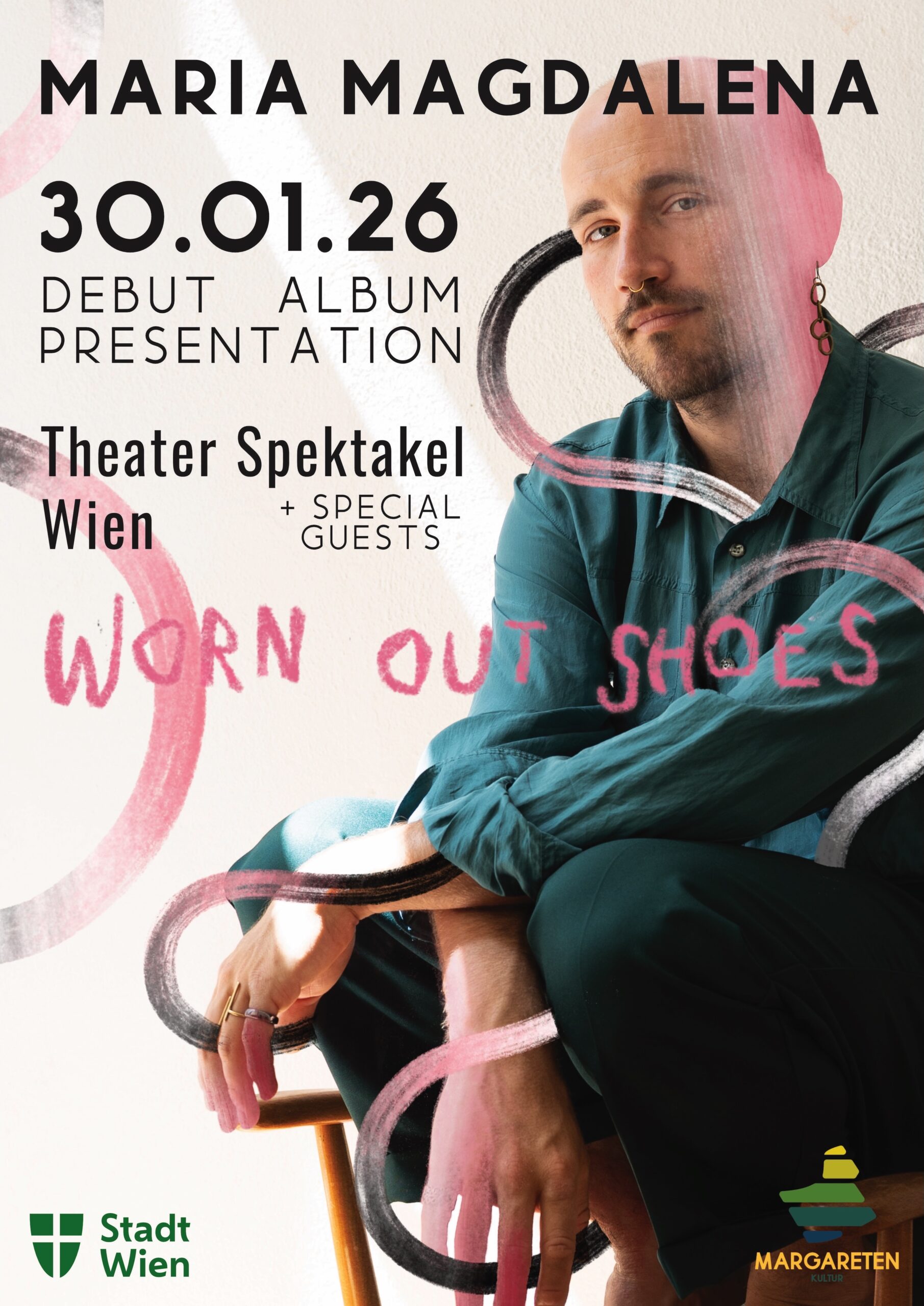 Worn Out Shoes ist das Debut-Album des in Wien lebenden Musikers Tobias Pöcksteiner aka Maria Magdalena. Die Songs darauf sind wie verschobene Momentaufnahmen. Oft geht es um Zwischenräume – zwischen den Höhen und Tiefen des Lebens, oder um Stimmungen, die sich über längere Zeit erstrecken. Mit vielen Gastmusiker*innen wie Gloria Amesbauer (GLAM), Verena Koppendorfer (IVERY), Lorenz Ferchländer, Michael Schatzmann, Markus W. Schneider und Milly Groz (MILLYCENT) entwickelt Maria Magdalena einen Sound zwischen Indie-Folk und sanfter Elektronik. Musik die nah wirkt, ohne gefällig sein zu wollen — mit reduzierten Mitteln und großer dynamischer Bandbreite, voller Tiefe und Intimität.